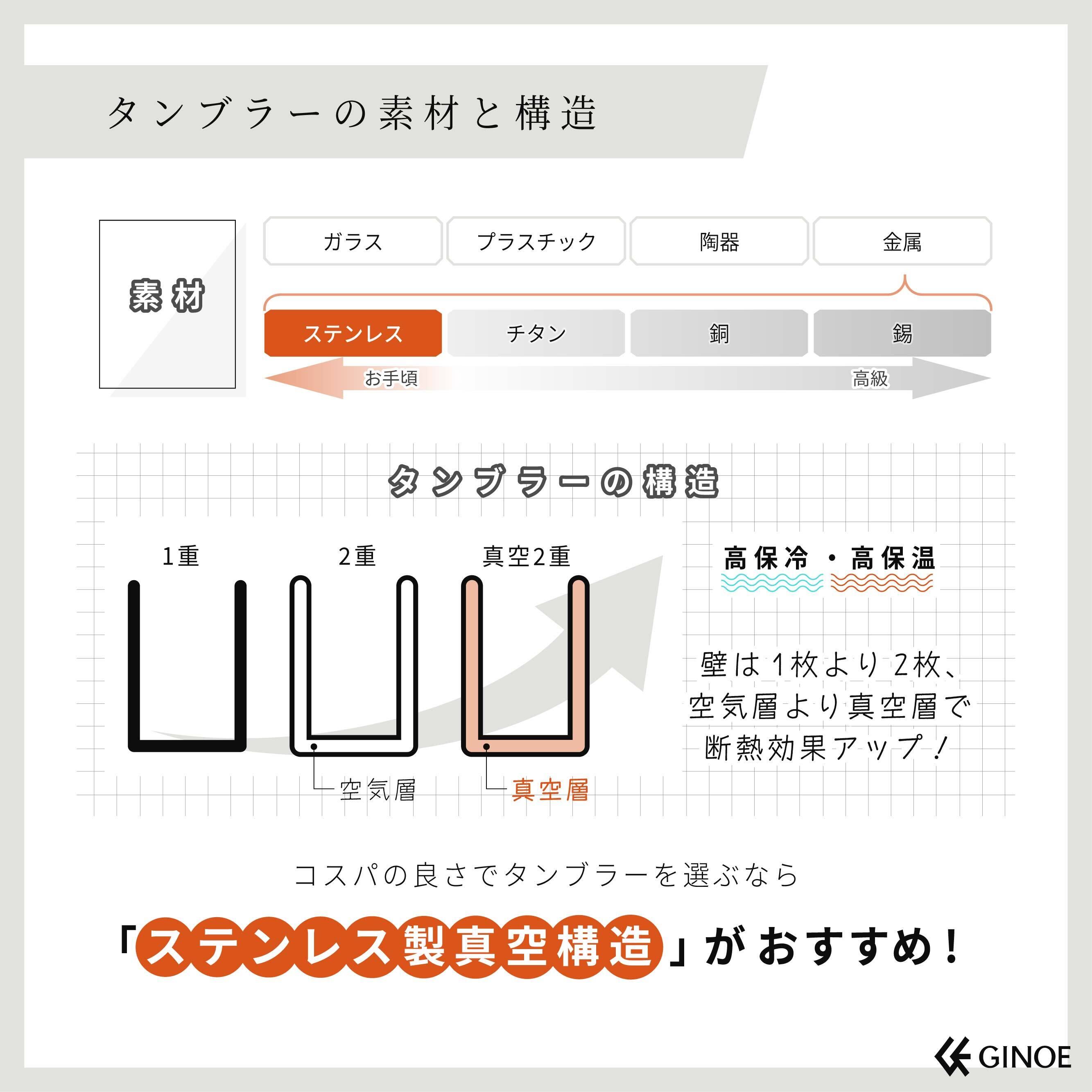 タンブラーの構造は大きく分けて3種類あり、その中でも最も保温保冷に優れるのが真空断熱2重構造。さらに350mlの飲料缶と真空層のすき間を極限まで詰めることで空気の入り込みを防ぎます。